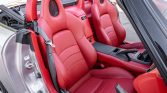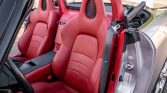 The cabin features seats upholstered in red leather with a matching dashboard, carpets, door panels, and roll hoops. Equipment includes aluminum pedals, cruise control, power aLessories, air conditioning, a locking glovebox, and a factory CD stereo hidden behind a door in the center stack. The seller notes a mark on the passenger-side door plastic, and that the alarm system is in need of service.