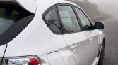 This five-door body is finished in Satin White Pearl (37J) and features a hood scoop, a rear spoiler, HID headlights, and an STi-branded lip spoiler. The front bumper cover and driver-side fog light trim were reportedly replaced after being damaged by contact with a parking lot curb in August 2018.