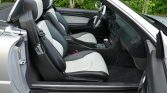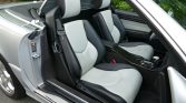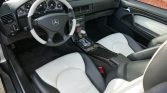 Cabin finishes include two-tone black and silver Nappa leather on the heated and power-adjustable seats, door panel inserts, shift knob, and steering wheel. Amenities include black wood veneers that were refinished in 2018 along with cruise control, automatic climate control, a retractable roll bar, a factory cassette stereo, and a trunk-mounted six-disc CD changer. The air-conditioning system was overhauled in 2019 with a replacement compressor and drier.