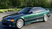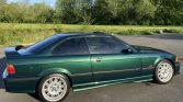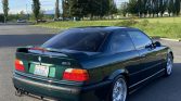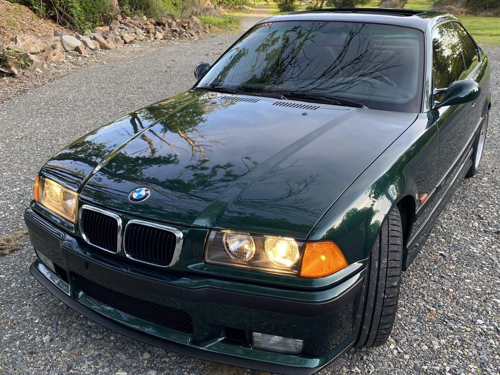 This 1999 BMW M3 coupe is a Canadian-market example finished in Fern Green Metallic over black Nappa leather upholstery, and it is powered by a 3.2-liter inline-six paired with a five-speed manual transmission and a limited-slip differential. Equipment includes a power sunroof, a raised rear spoiler, dual-zone automatic climate control, cruise control, an onboard computer, a Harman Kardon sound system, an Active Autowerke exhaust system, European-specification headlights, power aLessories, and heated Vader front sport seats.