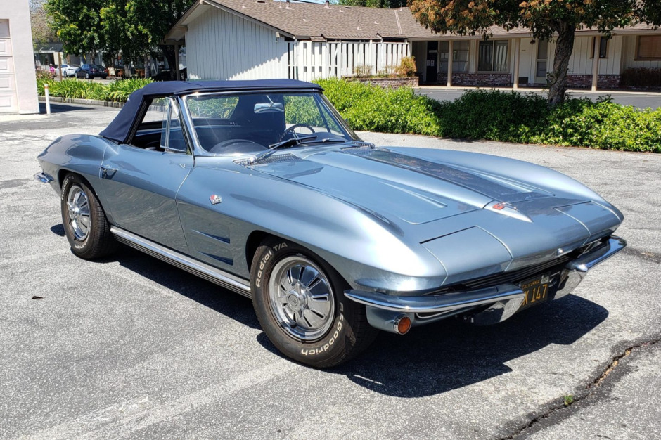 This 1964 Chevrolet Corvette convertible is finished in Daytona Blue over a matching interior and was purchased by the seller in 2001. The body was repainted in light blue and the seats were recovered with dark blue upholstery during previous ownership, and the car is equipped with a numbers-matching 327ci L76 V8 linked to a Tremec five-speed manual transmission that was fitted during current ownership. Additional equipment includes a Positraction rear end, a blue soft top, four-wheel disc brakes, and a Delco radio.
