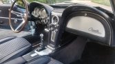 The interior was retrimmed with dark blue upholstery, and embroidered Corvette-logo floor mats protect the matching carpets. Amenities include a woodgrain steering wheel, a vertically mounted Delco radio, and an analog clock, the latter of which requires servicing.
