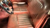 The cabin was upholstered in red leather from the factory and features a matching dashboard top, door panels, and carpets. Amenities include a dash-mounted rear-view mirror, a passenger-side grab handle, and map pockets in both doors. The seats show signs of discoloration, and seam separation is visible on the driver’s seat bottom.