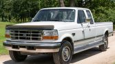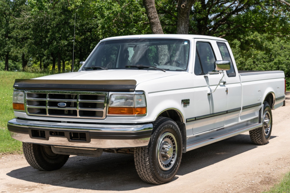 This 1994 Ford F-250 HD XLT is finished in white over gray cloth and powered by a 7.3-liter International Trucks turbodiesel V8 paired with a four-speed automatic transmission. Equipment includes dual fuel tanks, air conditioning, cruise control, power windows and locks, a sliding rear window, a center console, and an AM/FM cassette stereo. The seller acquired the truck in April 2021 and it now shows 34k miles.