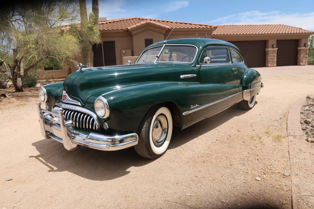 This 1948 Buick Roadmaster Sedanet was sold new by Vinton & Larsen of McMinnville, Oregon, and was acquired by the seller in 2010. The car is finished in Verde Green over gray cloth and is powered by a 320ci Fireball straight-eight paired with a two-speed Dynaflow automatic transmission. Features include chrome bumpers and trim, Van Auklen bumper guards, wide whitewall tires, and an optional AM radio, antenna, and back-up light. Recent service included repairing the starter solenoid and replacing the water pump and spark plugs.