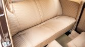 The cabin features seating that was reupholstered in striped cloth with brown piping and matching door trim panels. Equipment includes front quarter-panel fresh air vents, storage pockets in the dash, front bucket seats, a rear bench seat, floor mats, crank windows, and cream switchgear, knobs, and buttons.