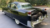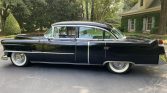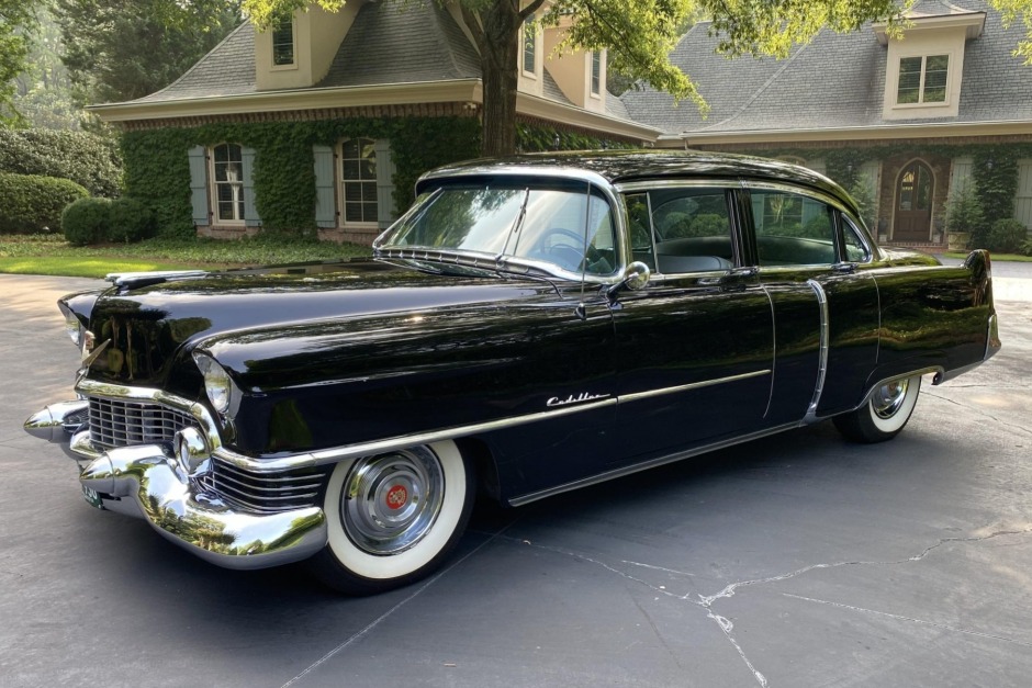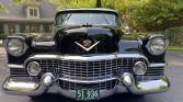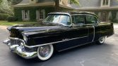 This 1954 Cadillac Series 62 sedan is finished in black over green, cream, and gray and was sold new at Quick Motors in Watertown, New York on July 27, 1954. It is powered by a 331ci V8 paired with a Hydra-Matic four-speed automatic transmission, and features include power steering, power brakes, a chrome grille, and bumpers, full wheel covers, a push-button AM/FM radio, reverse lamps, whitewall tires, a padded dash, and air conditioning. The car is said…