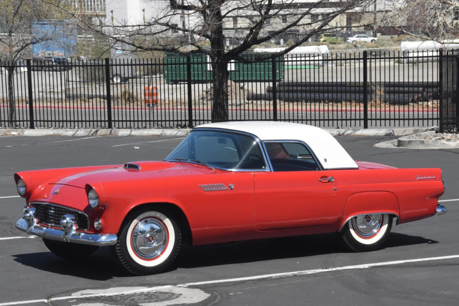 This 1955 Ford Thunderbird is said to have been initially delivered to Newark, New Jersey, and it was acquired by the Harrah’s Auto Collection in New York in 1973 and eventually relocated to Harrah properties in Nevada, where it has been displayed most recently at the National Automobile Museum. The body has been refinished in red over a black and white interior, and power comes from a 292ci V8 paired with a three-speed Ford-O-Matic automatic transmission. Equipment includes a removable white hardtop, wheel covers, a later model Holley carburetor, an aftermarket chrome air cleaner, power steering, power brakes, power windows, a power-operated bench seat, and a push-button radio. In preparation for the sale the brake fluid was flushed and the engine oil changed.