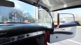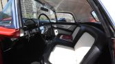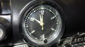 The interior is fitted with a power-operated bench seat trimmed in black and white upholstery with matching door panels and a black dashboard and carpeting. Other interior features include electric windows, chrome and simulated turned-aluminum trim, a clock, a heater, power steering, and a push-button AM radio.