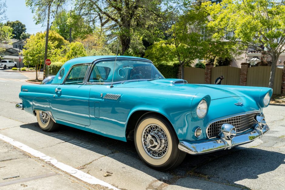 This 1956 Ford Thunderbird is finished in Peacock Blue over a two-tone interior and is powered by a 312ci V8 paired with a three-speed Ford-O-Matic transmission. Equipment includes a removable porthole hardtop, wire wheels, an AM radio, and a heater. The car was reportedly acquired by the seller’s father in the early 70s and was inherited by the seller in 2008.