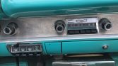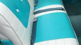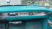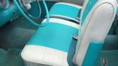 The cabin features a turquoise dashboard and carpets, and the bench seats and door panels are upholstered in turquoise and ivory vinyl. Equipment includes a heater, tissue dispenser, AM radio, and lap belts.