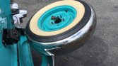 The car is finished in turquoise with a white convertible soft top and features a Continental spare tire kit, chrome bumpers and trim, contrasting quarter-panel inserts, and twin windsplits on the hood. The zipper for the convertible top window is broken.