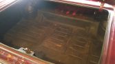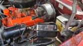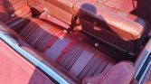 The cabin features two-tone red vinyl upholstery with a matching dashboard, carpets, and door panels. Equipment includes a power-adjustable split-folding front bench seat, power windows, dual sliding sun visors, and a Wonder Bar AM radio. The left turn signal does not automatically reset and the analog clock and rear speakers do not work.