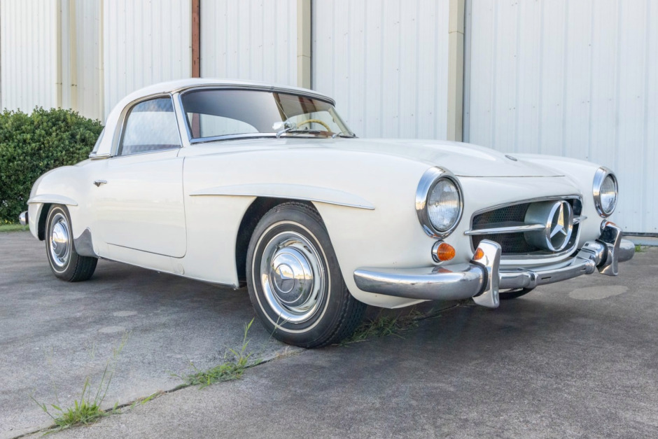 This 1961 Mercedes-Benz 190SL was purchased by the seller in 1976 following ownership history in Colorado, and it has reportedly been stored since 1979 with intermittent periods of use. The car is finished in white over red leather upholstery, and it is powered by a 1.9-liter inline-four paired with a four-speed manual transmission. Equipment includes a black soft top, a body-color removable hardtop, 13″ steel wheels, chromed hubcaps, and an aftermarket AM/FM push-button radio. Recent service is said to include a tune-up, fluid changes, and replacing the battery box and differential boot, and the seller states that additional work is required to make the car roadworthy.