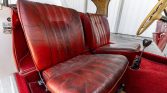 The cabin features red leather upholstery on the seats and door-panel inserts as well as a matching dash pad, carpets, and sun visors. The body-color dashboard houses a lockable glovebox and an AM/FM push-button radio. Other equipment includes an analog clock and a dash-mounted rear-view mirror. The carpet is missing from the passenger-side footwell, and the headliner and cabin upholstery are worn.