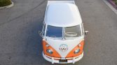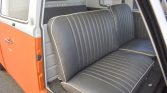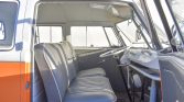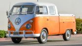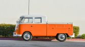 This 1964 Volkswagen Type 2 is a double-cab pickup finished in orange and white, and it is powered by a 1.2-liter flat-four paired with a four-speed manual transaxle. Equipment includes a bed with fold-down sides, 15″ wheels, hinged front and rear windows, a hand-painted front VW emblem, gray upholstery with white piping, a period-style digital radio, aftermarket kick-panel speakers, and a replacement fuse box. The truck was acquired by the current owner in 2017, reportedly following ownership…