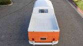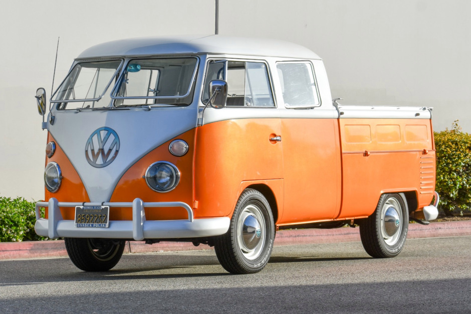 This 1964 Volkswagen Type 2 is a double-cab pickup finished in orange and white, and it is powered by a 1.2-liter flat-four paired with a four-speed manual transaxle. Equipment includes a bed with fold-down sides, 15″ wheels, hinged front and rear windows, a hand-painted front VW emblem, gray upholstery with white piping, a period-style digital radio, aftermarket kick-panel speakers, and a replacement fuse box. The truck was acquired by the current owner in 2017, reportedly following ownership history in California.