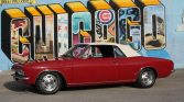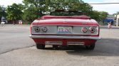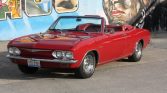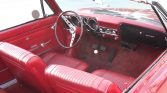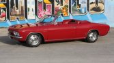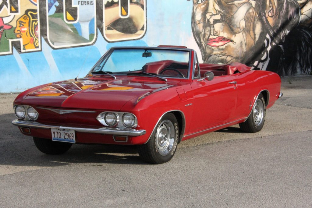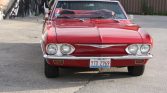 This 1965 Chevrolet Corvair Corsa is finished in red over a matching interior and powered by a replacement turbocharged 164ci flat-six paired with a replacement four-speed manual transaxle. Equipment includes a white convertible soft top, 14″ Rally wheels, front bucket seats, and a push-button AM/FM radio.