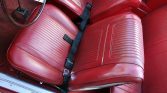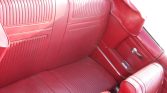 The cabin features red vinyl seat upholstery with a matching dash pad, door panels, and carpeting. Features include front sport bucket seats, black trim on the dashboard, a cue-ball shift knob, and a push-button AM/FM radio.