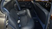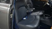 The cabin features seats trimmed in blue leather with matching door panels and carpets. Woodgrain trim is found throughout the cabin, and shoulder belts are fitted for front and rear occupants. Amenities include an aftermarket push-button radio, a locking glovebox, opening front 3/4 vent windows, and toggle switches for vehicle functions.