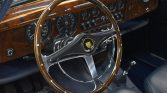 A wood-rimmed three-spoke steering wheel sits ahead of a woodgrain dashboard housing Smiths instrumentation, including a 240-km/h speedometer and a 6k-rpm tachometer with an inset analog clock. A quartet of auxiliary instrumentation is found in the center stack and includes displays for coolant temperature, oil pressure, fuel level, and amperage. The five-digit odometer shows 71k kilometers (~44k miles).