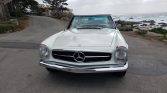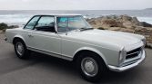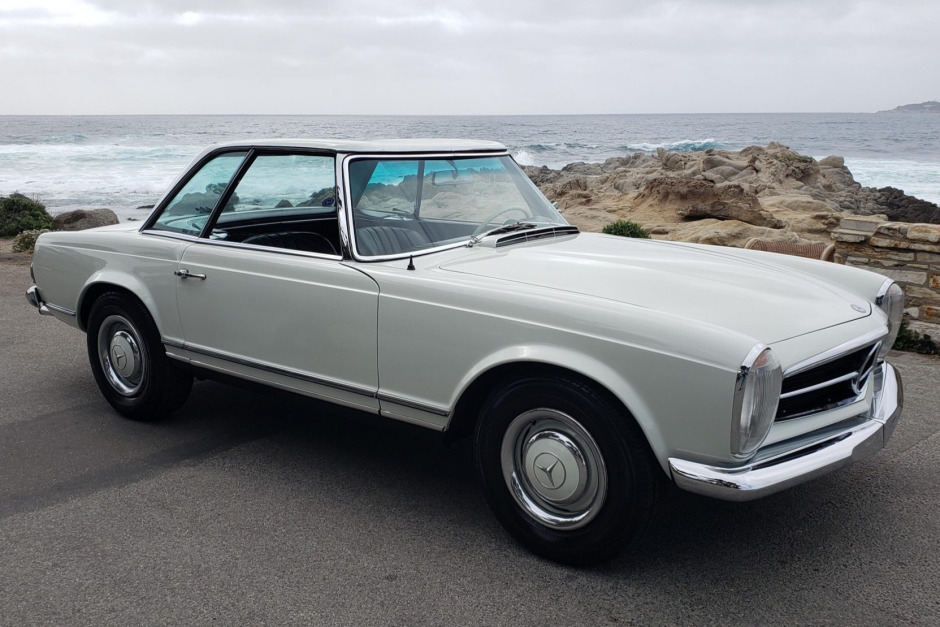 This 1966 Mercedes-Benz 230SL is finished in white over black and is powered by a replacement 2.3-liter inline-six paired with a four-speed automatic transmission. Equipment includes a removable Pagoda hardtop, chrome trim, European-style headlamps, and a Sony CD player. The car was sold new by Stahl Motor Company in Monterey, California, and was acquired by the seller out of Pebble Beach in 2006, reportedly from the original owner. The spark plugs and oil were changed in April 2021.