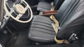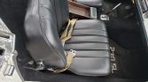 The interior features low-back bucket seats upholstered in black leather along with a matching dash pad, door panels, and carpets. The carpets are said to have been replaced in 2007, and amenities include wood trim, lap belts, and a Sony CD player. Replacement window seals and the removed factory radio are included in the sale. The right window slides need to be reattached, and flaws include a scrape and a tear on the dash pad and a tear and a puncture in the hardtop headliner.