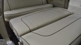 The cabin features cream vinyl upholstery with brown piping along with salt-and-pepper carpeting throughout. Equipment includes a column-mounted shifter, cruise control, a period radio, an analog clock, and a front bench seat that can be adjusted to lie flat.