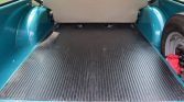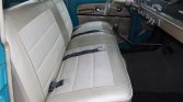 The cabin features body-colored steel surfaces as well as two rows of bench seating upholstered in beige vinyl with cloth inserts.