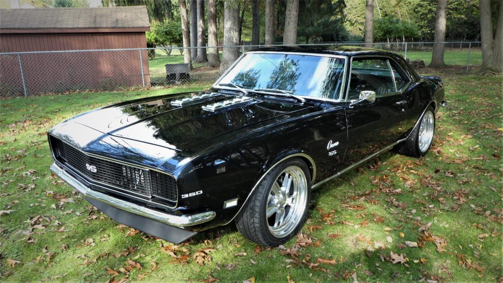 This 1968 Chevrolet Camaro RS was acquired by the seller in 1981 and underwent a body-off refurbishment completed in 2013 that included replacing the floor, roof, and quarter panels, a repaint, reupholstering the interior, and rebuilding the brakes and suspension. The car is finished in black with a gray front accent stripe over black vinyl and is powered by a 383ci stroker V8 paired with a Tremec five-speed manual transmission. Additional equipment includes the Rally Sport equipment package, 18″ alloy wheels, BAER disc brakes, front and rear lip spoilers, chrome bumpers, an SS-style hood, a center console with auxiliary gauges, and a push-button AM/FM radio.