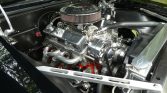 The 383ci stroker V8 is equipped with Trick Flow heads, an Edelbrock aluminum intake, a Comp Cams hydraulic roller camshaft, forged pistons and rods, and a March Performance belt drive system. Cooling is provided by an Edelbrock water pump and an aluminum radiator with an electric fan. An MSD distributor has been fitted along with a Mallory ignition box, Pertonix coil, and trunk-mounted Optima battery.