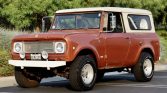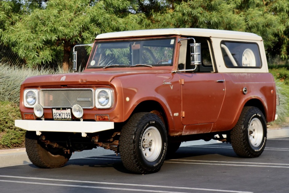 This 1969 International Harvester Scout 800A is finished in copper over black vinyl and patterned cloth and is powered by a 304ci V8 paired with a four-speed manual transmission and a dual-range transfer case. Equipment includes 15″ aftermarket wheels, BF Goodrich All-Terrain T/A KO2 tires, custom bumpers, a removable hardtop, as well as power steering and power brakes. The truck was acquired by the seller in 2017, and subsequent service reportedly included re-gearing the front and rear differentials along with replacing the shocks and springs.
