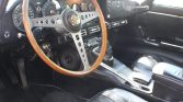 The wood-rimmed steering wheel frames Smiths instrumentation consisting of a 160-mph speedometer and a tachometer with a 5k-rpm redline. An ammeter, analog clock, and auxiliary gauges displaying coolant temperature, oil pressure, and fuel level are centrally housed in the dashboard. 60k miles are shown on the five-digit odometer.