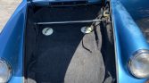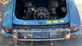 The car was delivered new in Polo Red and was refinished in the current Gemini Blue Metallic under previous ownership. Equipment includes hood-mounted Cibie driving lights, an Amco roof rack and rear bumper guard, and various driving event badges. The seller notes that the front latch panel, front suspension pan, right and left lateral supports, inner fender panels, and battery boxes were replaced by Restoration Designs replacement panels to correct rust.