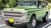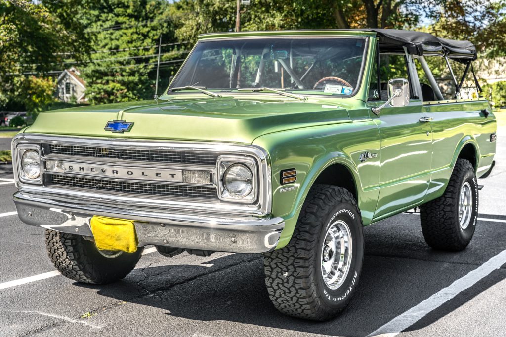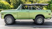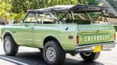 This 1970 Chevrolet K5 Blazer 4×4 is finished in green over a black vinyl and houndstooth cloth interior and is powered by a 350ci V8 paired with a four-speed manual transmission and a dual-range transfer case. Equipment includes a four-point roll bar, 15″ Ultra wheels, manually-locking front hubs, chrome bumpers, a Pioneer stereo, and a rear bench seat.