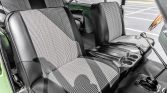The cabin features black vinyl seats with houndstooth cloth inserts as well as black rubber floor coverings and painted metal surfaces. Equipment includes manual windows and door locks, a center console with cupholders, and a Pioneer AM/FM/cassette stereo. A four-point roll bar is fitted behind the front seats.