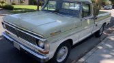 This 1970 Ford F-250 was purchased new by the seller’s father-in-law and acquired by the seller in 1988. The truck is finished in two-tone Yucatan Gold and Wimbledon White and powered by a 360ci V8 paired with a three-speed automatic transmission. Equipment includes the Sport Custom trim package, power steering and brakes, an auxiliary fuel tank, a steel diamond-plate rear bumper, extended side mirrors, a bench seat, and a sliding rear window.