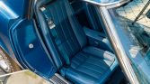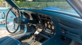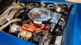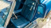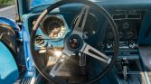 The cabin features bucket seats upholstered in blue vinyl along with a matching dashboard, door panels, and carpeting. Amenities include air conditioning, over-shoulder seat belts, Corvette-branded rubber floor mats, and an AM/FM radio.