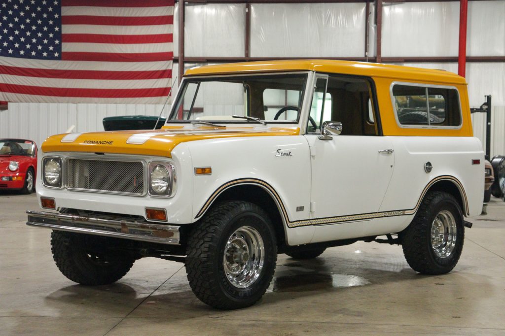 This 1971 International Harvester Scout 800B Comanche is finished in white with an ochre removable hardtop over a black vinyl interior and is powered by a 232ci inline-six paired with a three-speed manual transmission and a dual-range transfer case. Features include air conditioning, a push-button AM radio, a tow ball, sliding rear quarter windows, Warn locking front hubs, and 15″ polished steel wheels. The truck is said to have resided in California prior to the current owner’s acquisition in January 2020.