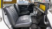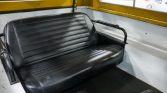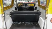 The cabin features front bucket seats and a rear bench upholstered in black vinyl. Additional equipment includes air conditioning, a heater, a push-button AM radio, and an ochre-finished glovebox door and instrument panel.