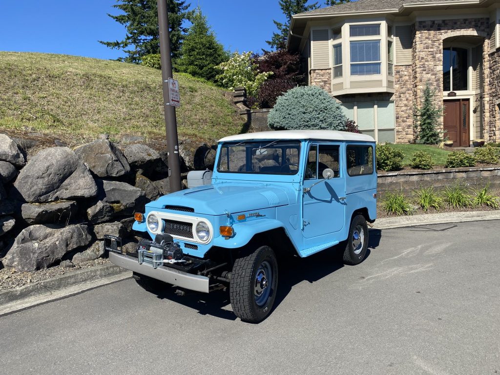 This 1971 Toyota Land Cruiser FJ40 is finished in blue with a white roof over gray and is powered by a 3.9-liter inline-six paired with a three-speed manual gearbox and a dual-range transfer case. Equipment includes a Smittybilt winch, 15″ steel wheels with polished hub caps, locking front Warn hubs, side mirrors, inward-facing rear bench seats, and a rear-mounted spare tire. The truck was acquired by the seller in 2020, and subsequent work included replacement of the engine, spark plugs, water pump, clutch, master cylinder, and shocks as well as a tune-up and fluid changes.