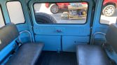 The cabin features a split front bench and inward-facing fold-up rear seats with gray upholstery. Amenities include lap belts, manual windows, a diamond plate patterned rubber floor liner, a cabin heater, and an Alpine AM/FM/CD stereo installed in the glove box.