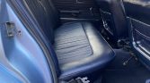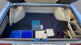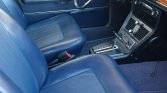 The seating surfaces are trimmed in dark blue upholstery with textured inserts and matching headrests, door panels, and floor mats. Amenities include wood dashboard trim and a factory Becker Europa II stereo with aftermarket Bluetooth, USB, and voice-control integration. The driver’s seat bottom was repaired to address a tear, the front seat belts were replaced, and the air-conditioning system was overhauled during current ownership.