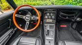 The replacement three-spoke walnut steering wheel with a Corvette center cap frames a 160-mph speedometer and a 7k-rpm tachometer. Auxiliary gauges for coolant temperature, fuel level, oil pressure, and voltage are mounted in the center stack. The five-digit odometer shows 2k miles.