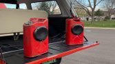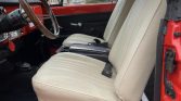 The cabin features front bucket seats and a rear bench upholstered in replacement Parchment vinyl with black door panels and replacement carpets. Bedliner is present below the carpeting, the front seat foam has been replaced, and hydraulic struts have been added to the rear hatch. The center console features integrated cup holders and houses an aftermarket stereo linked to replacement door speakers, as well as rear-mounted speakers that are installed in moveable jerrycans. An AM radio is retained in the factory location and is connected to a dash-mounted speaker. CST badging has also been added to the dash.