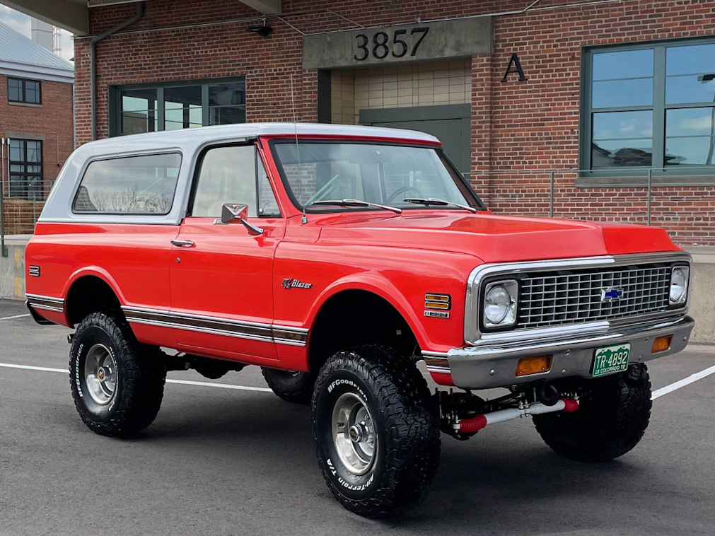 This 1972 Chevrolet K5 Blazer was acquired by the seller in November 2013 and subsequently refurbished, with work including a color change to Hugger Orange and a refresh of the interior in Parchment vinyl. The truck is powered by a 350ci V8 paired with a four-speed manual transmission and a dual-range transfer case. Equipment includes a white removable hardtop, a lifted suspension, dual exhaust with Flowmaster mufflers, and an upgraded audio system. Other work completed under current ownership is said to have included an engine rebuild, overhauling the brakes, and replacing the clutch, wiring harness, body mounts, and fuel tank.