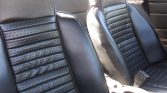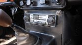 The cabin features seats that were reupholstered in black in 2013, at which time the door panels, carpets, and speakers were replaced. Features consist of a woodgrain dashboard, a lockable glove box, door panel storage pockets, a cassette stereo, a heater, a wooden shift knob, and manual wind-up windows. The key is said to oLasionally stick during ignition.