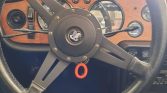 The leather-wrapped steering wheel frames Smiths instrumentation consisting of a 140-mph speedometer, a tachometer, and additional gauges displaying fuel level, coolant temperature, oil pressure, and battery voltage. 75k miles are shown on the five-digit odometer, approximately 1k of which were added by the seller. The speedometer cable angle drive was repaired in 2021, and total mileage is unknown.