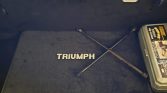 The cabin features high-back seats upholstered in blue vinyl with black piping, and features include a woodgrain dashboard and shift knob as well as a lockable glovebox, door panel storage pockets, Triumph-branded floor mats, and an Optimus AM/FM cassette stereo. The left window regulator was replaced during current ownership along with the mirror and floor mats, an uninstalled replacement right-side window regulator is included in the sale.