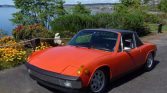 This 1973 Porsche 914 is finished in red over black and its replacement 2.0-liter flat-four is paired with a five-speed manual transaxle. Features include Fuchs-style wheels, disc brakes, a removable roof panel, replacement speakers, and an aftermarket stereo.
